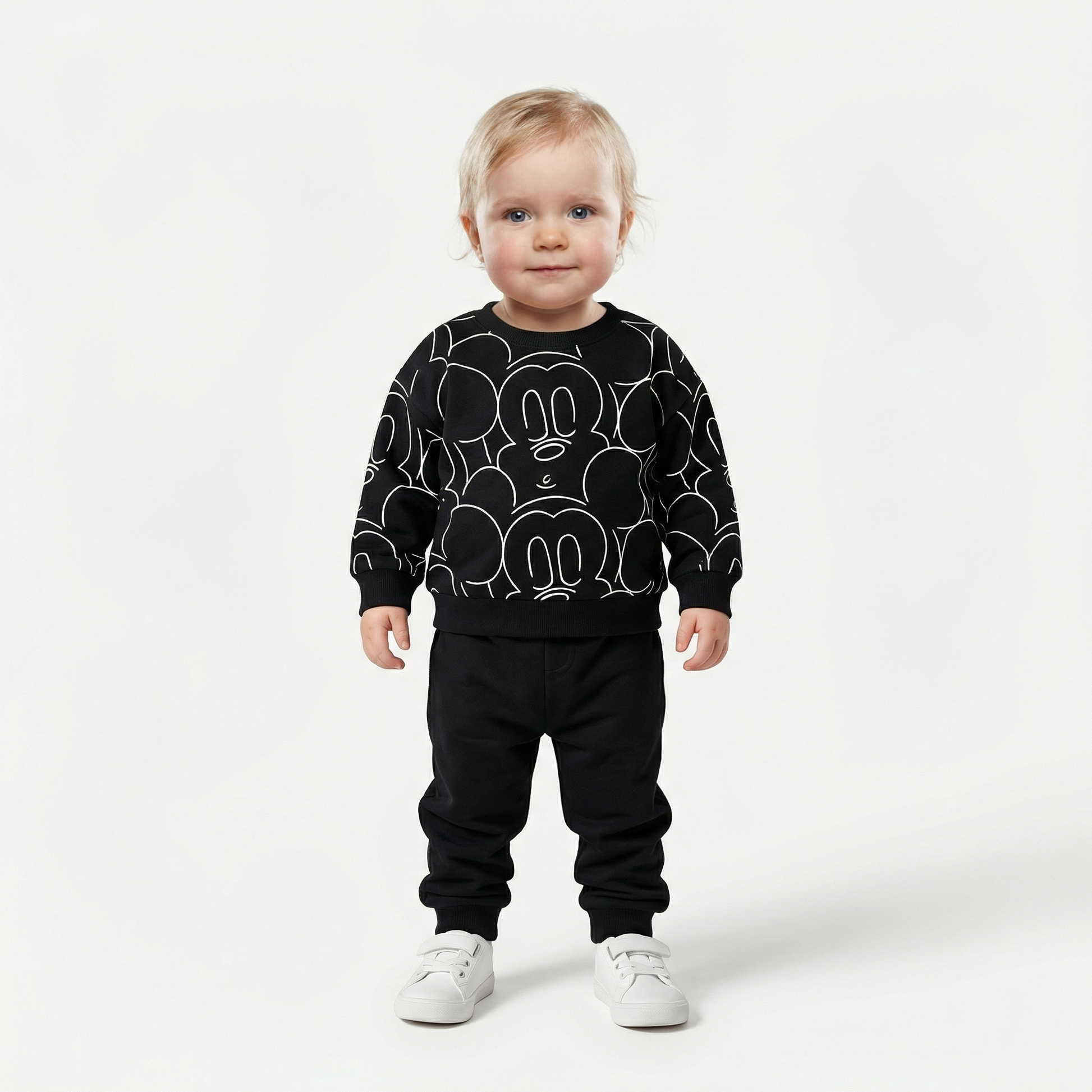 Adorable cotton outfit set featuring a cute printed sweatshirt paired with matching pants. Perfect for toddlers and young children, this two-piece ensemble combines comfort with playful style. Made from soft cotton-elastane blend, it's ideal for spring and autumn wear. True to size with full sleeves and a classic crew neck.