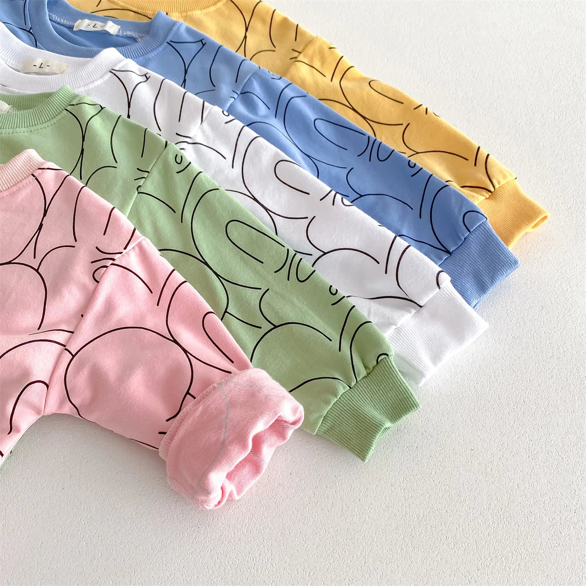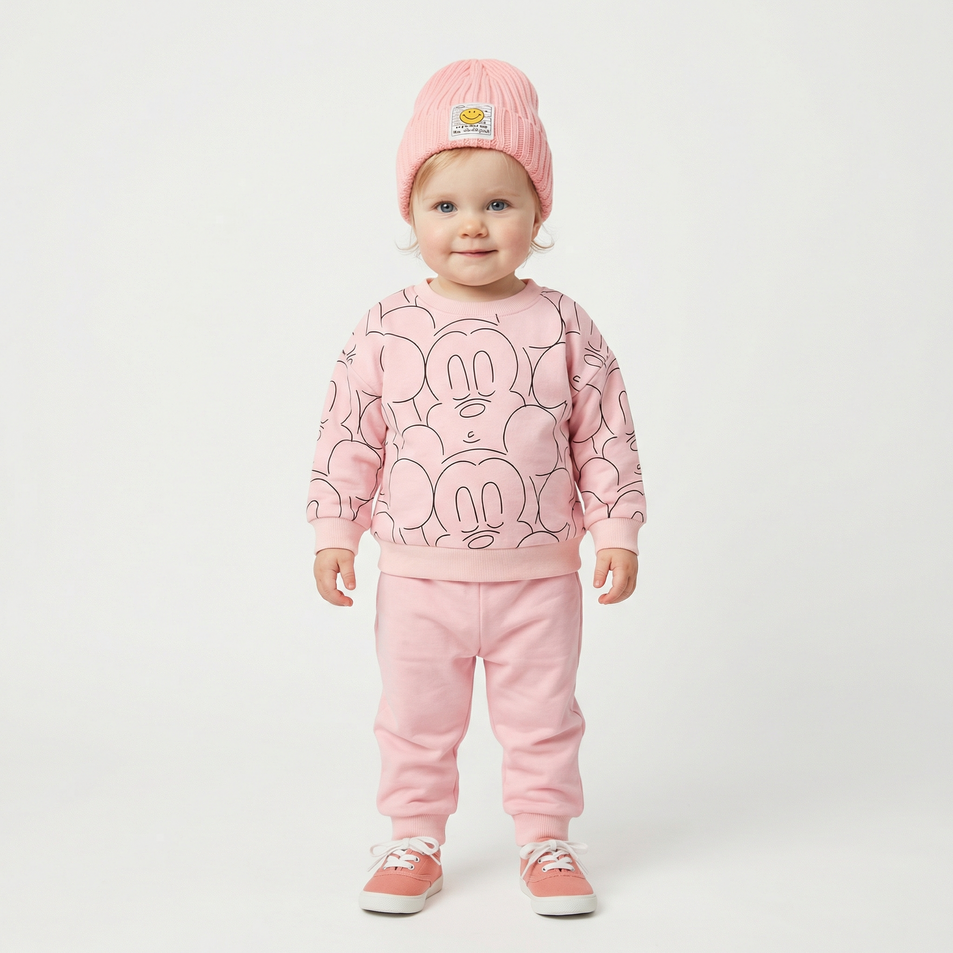 Adorable cotton outfit set featuring a cute printed sweatshirt paired with matching pants. Perfect for toddlers and young children, this two-piece ensemble combines comfort with playful style. Made from soft cotton-elastane blend, it's ideal for spring and autumn wear. True to size with full sleeves and a classic crew neck.