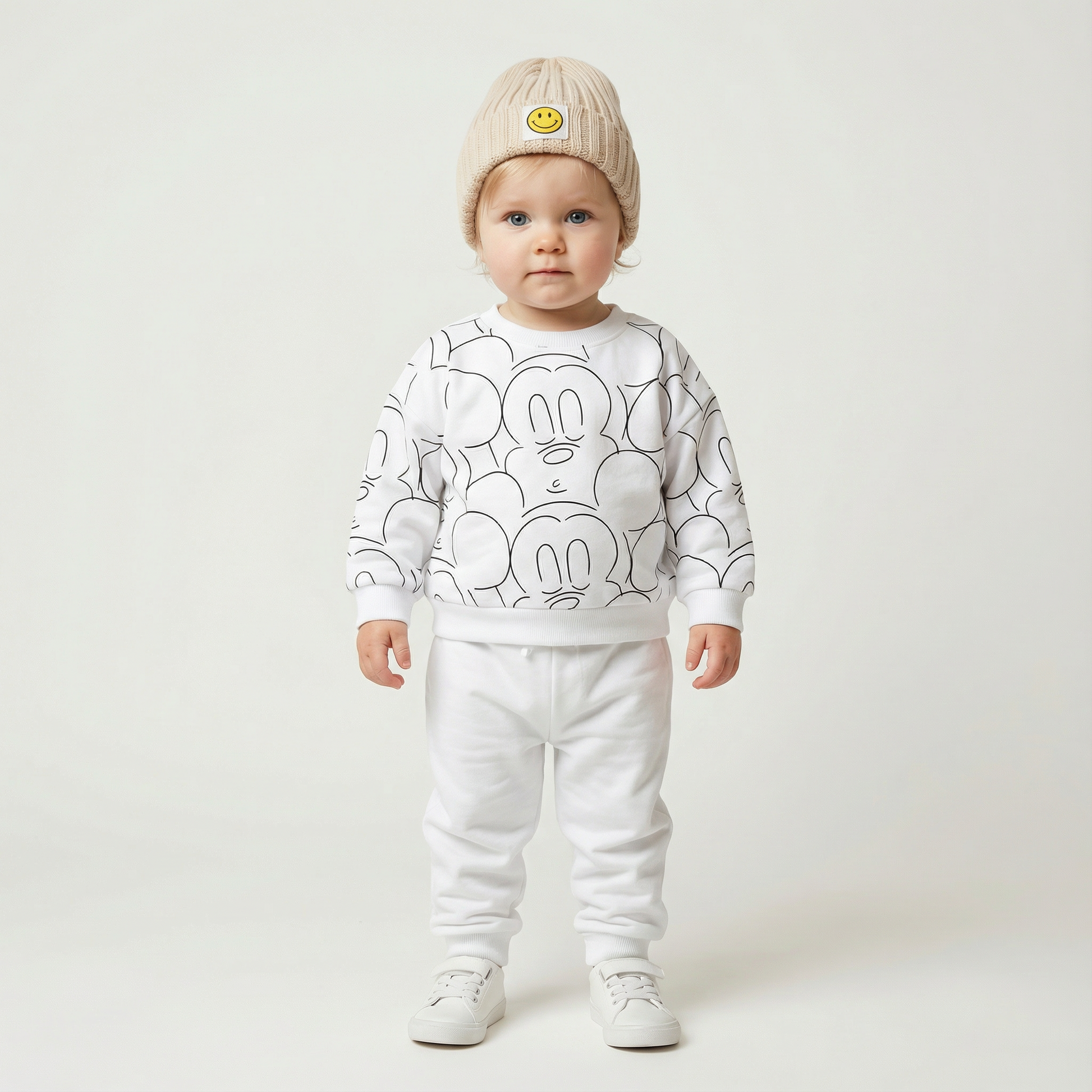 Adorable cotton outfit set featuring a cute printed sweatshirt paired with matching pants. Perfect for toddlers and young children, this two-piece ensemble combines comfort with playful style. Made from soft cotton-elastane blend, it's ideal for spring and autumn wear. True to size with full sleeves and a classic crew neck.