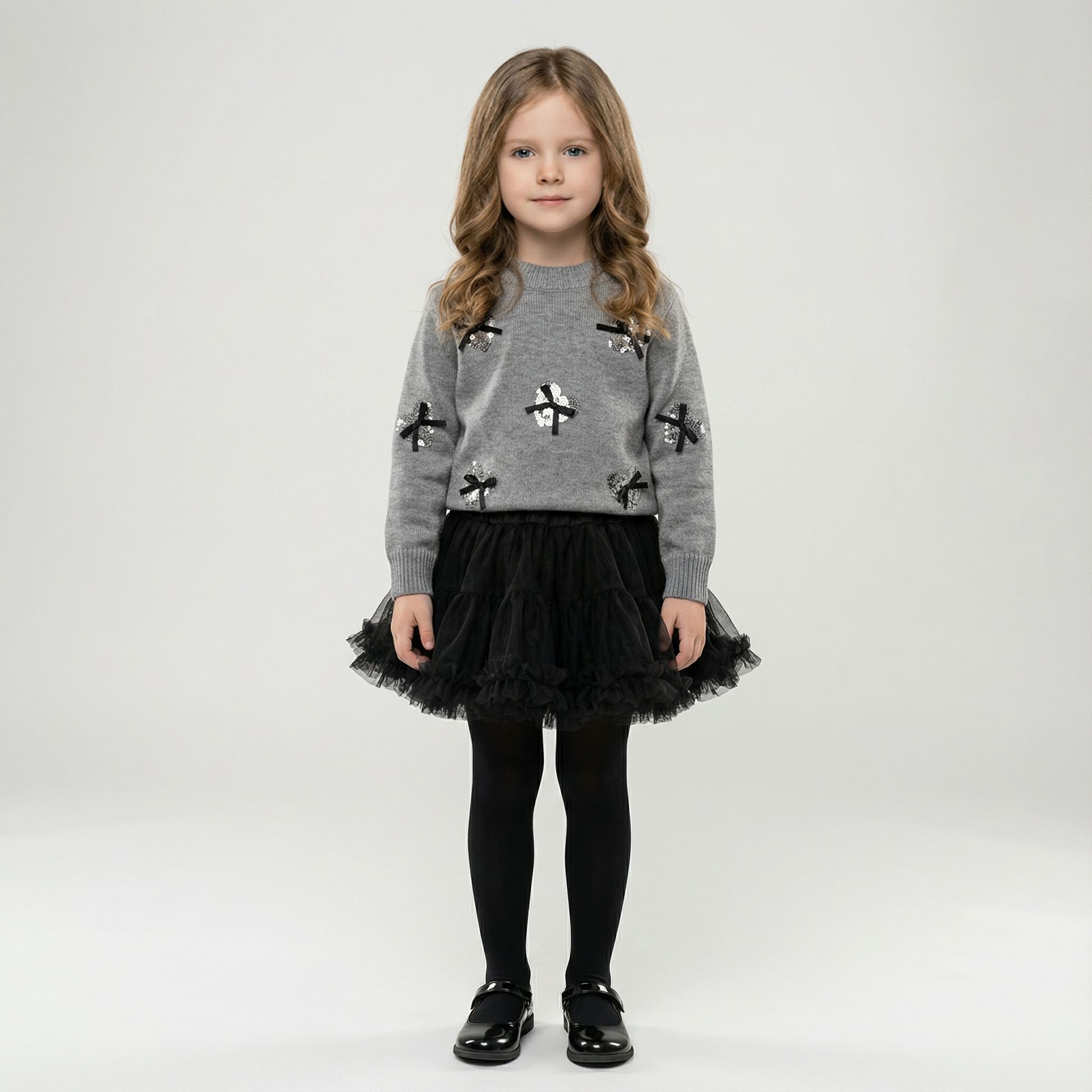 Cozy knitted two-piece set for girls featuring a pullover sweater and matching skirt. Made from soft cotton blend with details and full sleeves. True-to-size fit. Casual design perfect for everyday wear.