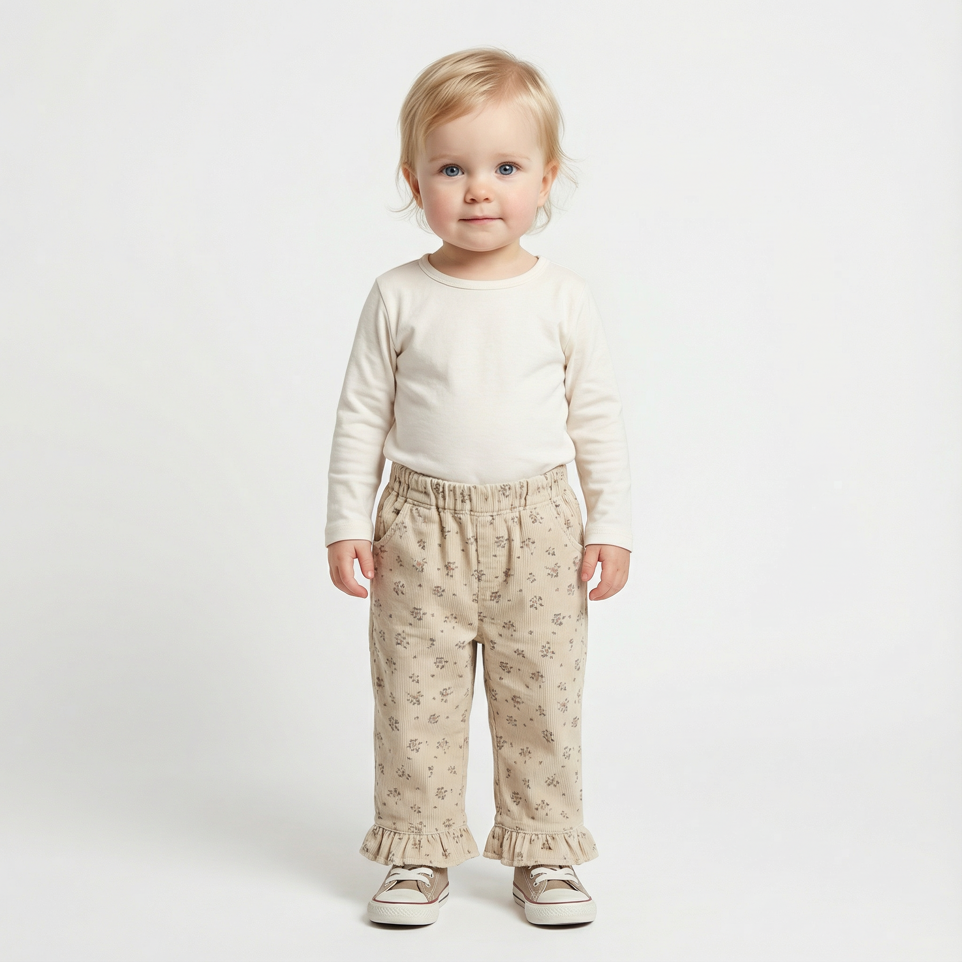 Comfortable and stylish casual pants for babies and toddlers with a soft knitted texture. Features a relaxed fit with an elastic waist for easy dressing, complemented by practical pockets and charming floral print details. Machine washable for convenient care. Available in five sizes spanning 6 months to 3 years. Ideal for everyday wear and outdoor play.