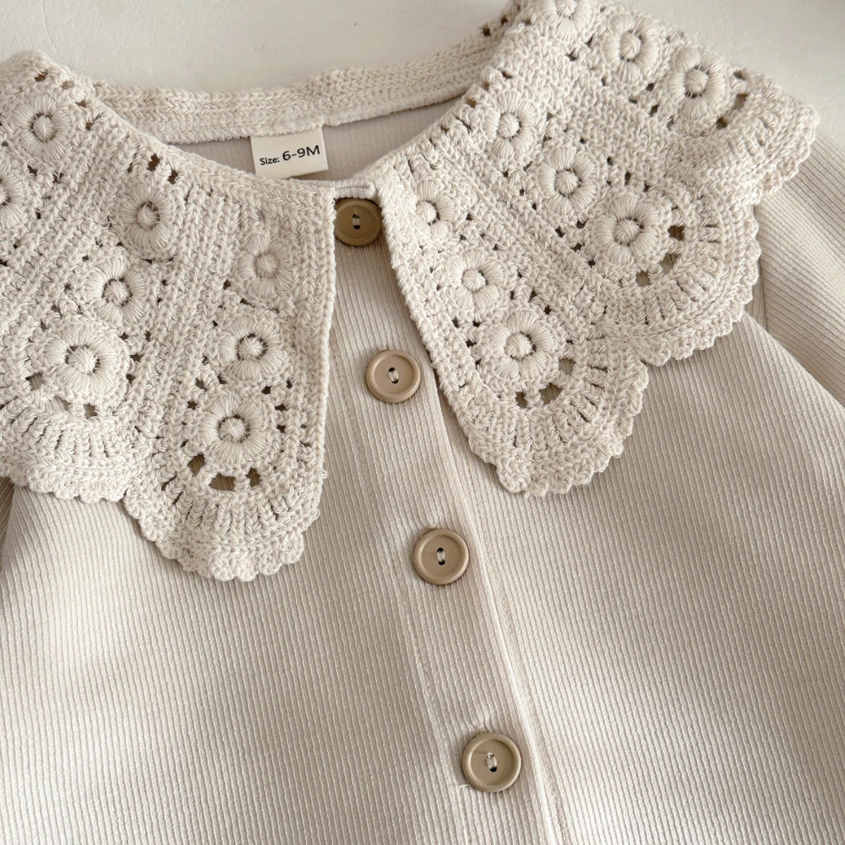 Two-piece set featuring a knit sweatshirt with lace collar and coordinating elastic-waist pants. Crafted from a breathable blend viscose, and elastane for comfort and durability. Machine washable for easy care. Available in sizes 6-9 months through 2-3 years. Perfect for fall and spring layering.