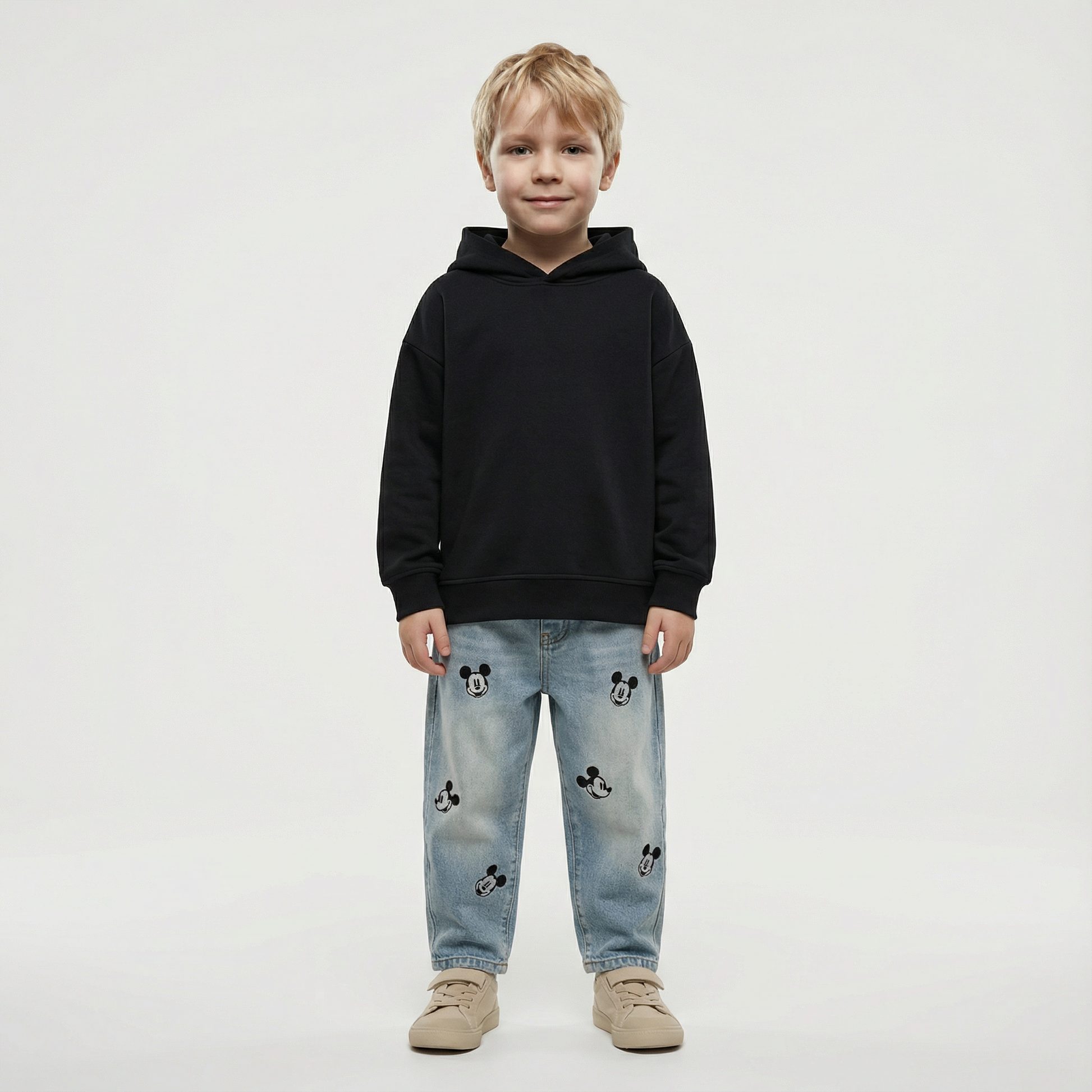 These stylish kids’ denim jeans feature a soft light-wash finish with playful all-over cartoon embroidery for a fun yet modern look. Designed with an elastic waistband, they offer comfort and ease of movement, making them ideal for everyday wear.