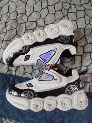 Casual Shoes with LED Light-Up Soles. Light up playtime with these shoes featuring vibrant LED soles that kids love. These shoes combine comfort with fun, boasting PU leather uppers, EVA outsoles for durability, and hook-and-loop closures for easy on-and-off. The anti-slip design and waterproof construction make them ideal for active play across all seasons. True-to-size fit with Lycra lining ensures all-day comfort. Available in red, white and blue with playful car graphics.