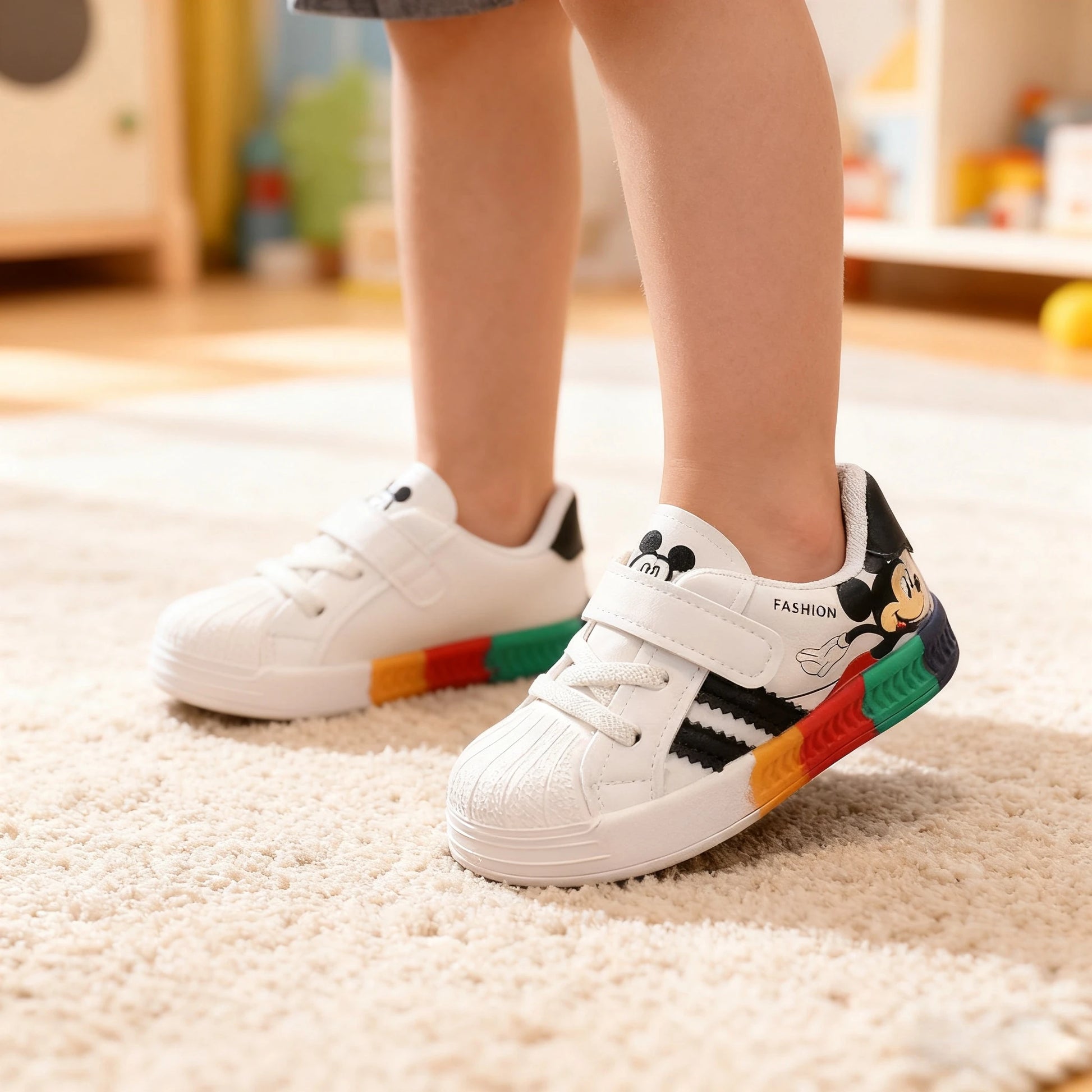 Children's Casual Shoes featuring Mickey Mouse designs for toddlers. These unisex sneakers combine PU leather uppers with rubber outsoles and EVA insoles for comfort and durability. Hook-and-loop closure ensures easy on-and-off wear, while breathable canvas lining keeps feet cool. Waterproof construction and true-to-size fit make them ideal for active play across all seasons. Available in sizes 15-25.