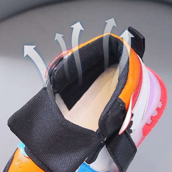 Minnie & Mickey Mouse sneakers with LED luminescent accents. Crafted from durable PU leather with breathable mesh lining and EVA insole for comfort. Hook-and-loop closure ensures easy on-and-off for young wearers. High-top construction with rubber outsole provides stability for active play. Perfect for everyday wear across all seasons.