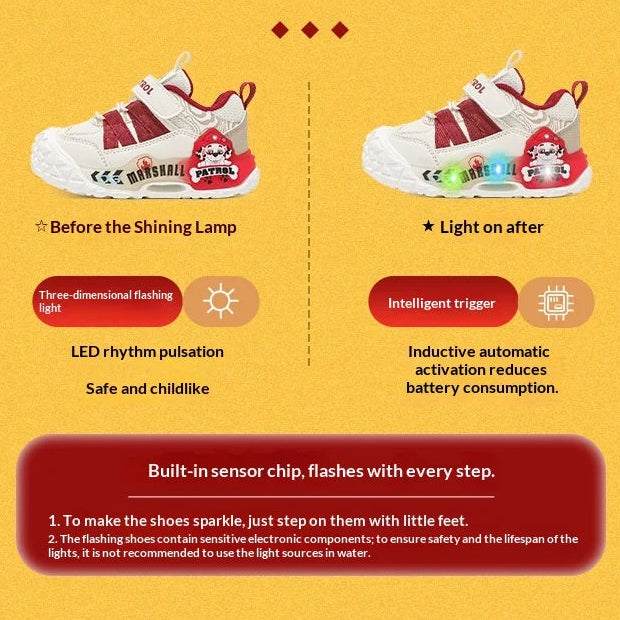 PAW Patrol LED light-up sneakers for kids. Features adjustable straps, breathable mesh upper, and non-slip EVA sole for safe, comfortable wear. Waterproof design suits all seasons. Perfect for young fans of the beloved cartoon series.