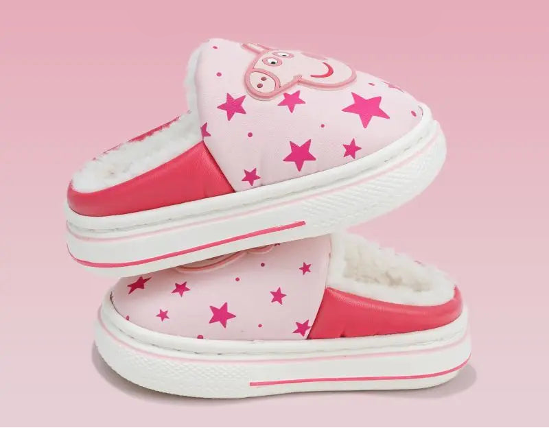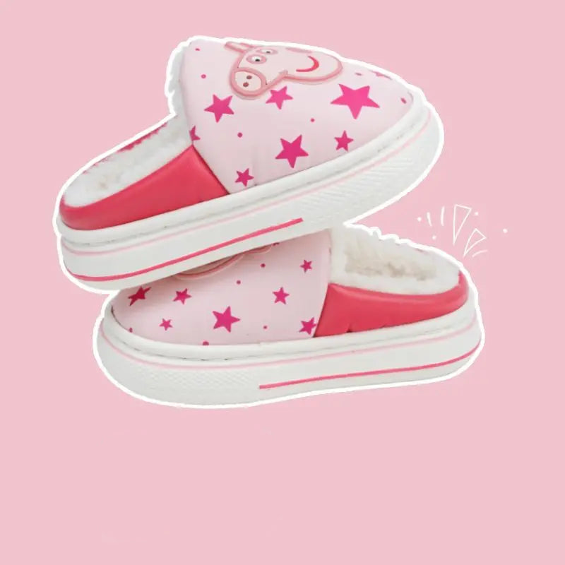 Cozy Peppa & George Pig slippers designed for children. Crafted from soft plush material with a thick, cushioned sole for warmth and comfort. Unisex style features adorable characters that kids love. CE certified, made from quality materials with no harmful chemicals. Perfect for indoor wear or casual lounging.