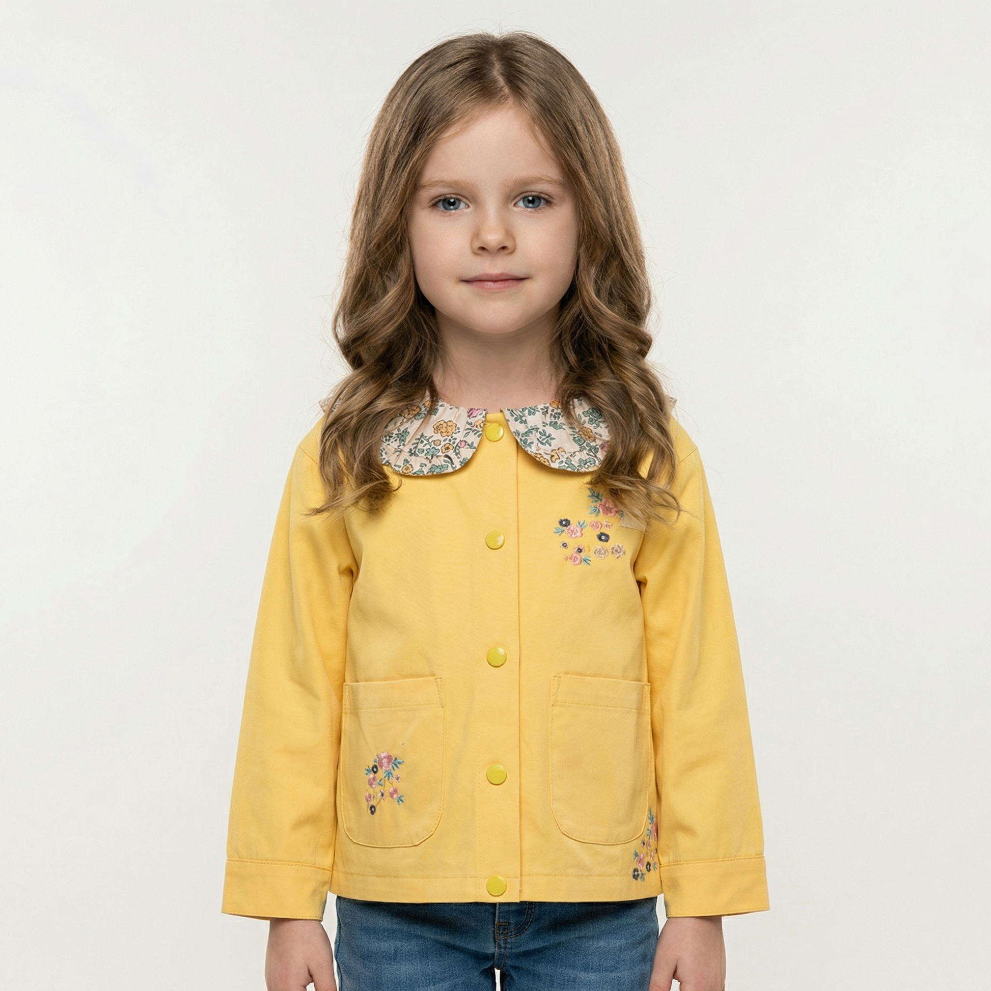 Cotton jacket for girls aged 2-7 years. Features a lapel collar, embroidered floral design, and single-breasted closure. Full sleeves, true-to-size fit, and heavyweight construction ideal for spring and autumn wear. Casual style suitable for everyday outings.