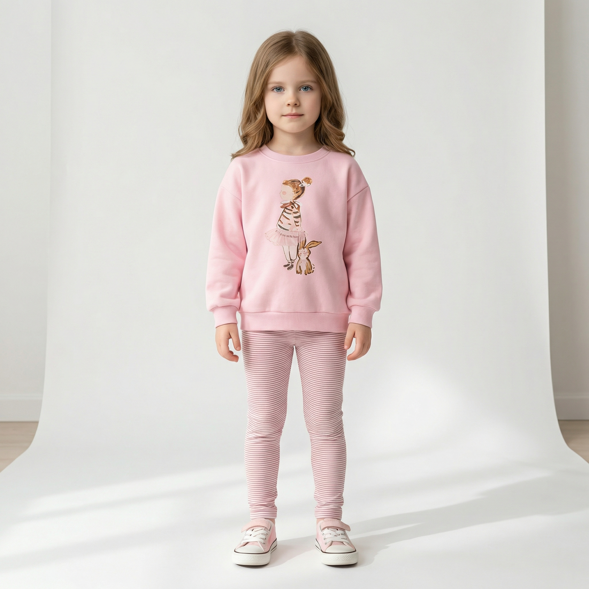 Charming two-piece set combines comfort with playful style for young girls. Featuring a soft cotton-blend top with a cheerful design and coordinating pants, this outfit is perfect for spring and autumn wear. True-to-size fit, casual design, and quality materials make it an easy choice for active toddlers and children aged 2-7 years.
