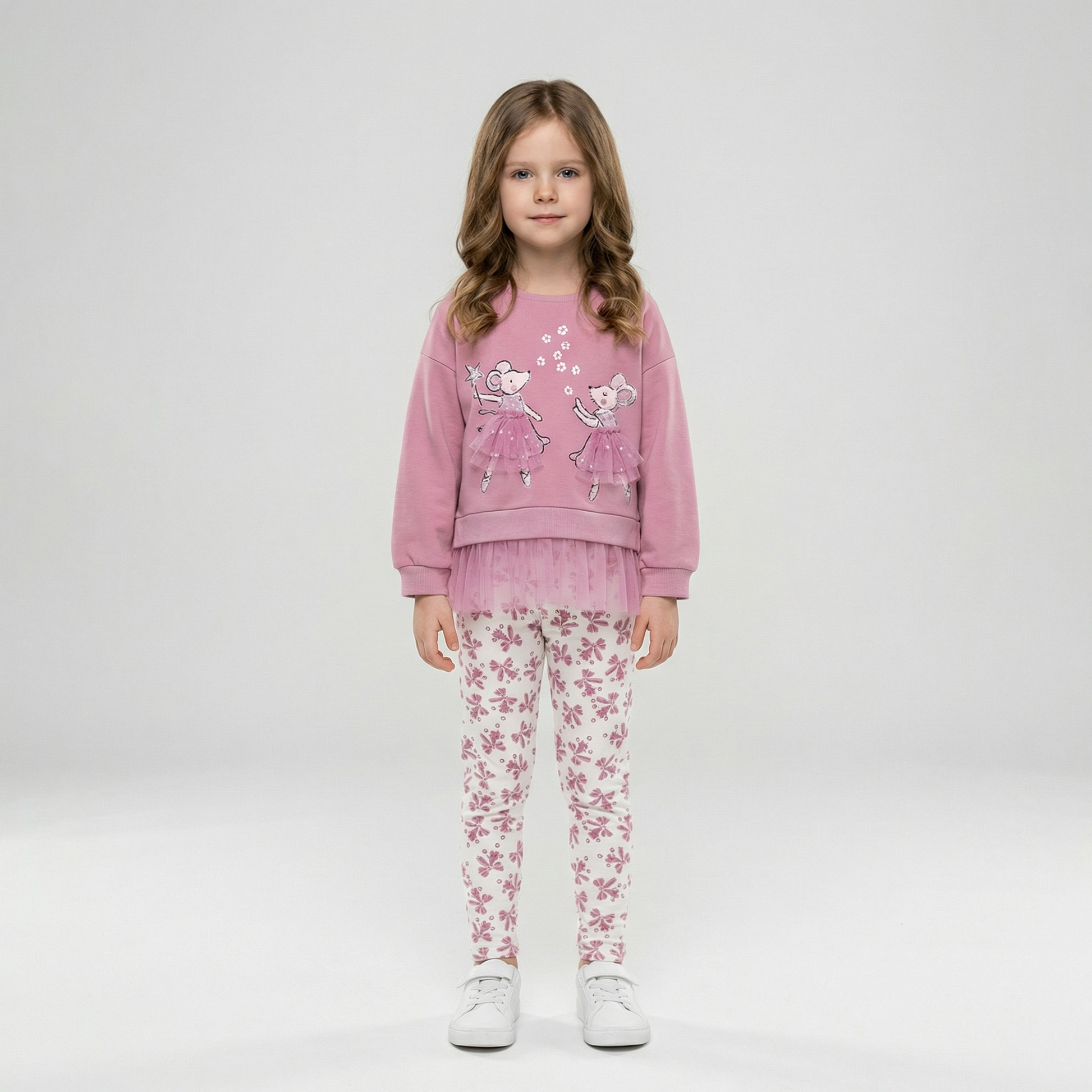 Charming two-piece set combines comfort with playful style for young girls. Featuring a soft cotton-blend top with a cheerful design and coordinating pants, this outfit is perfect for spring and autumn wear. True-to-size fit, casual design, and quality materials make it an easy choice for active toddlers and children aged 2-7 years.
