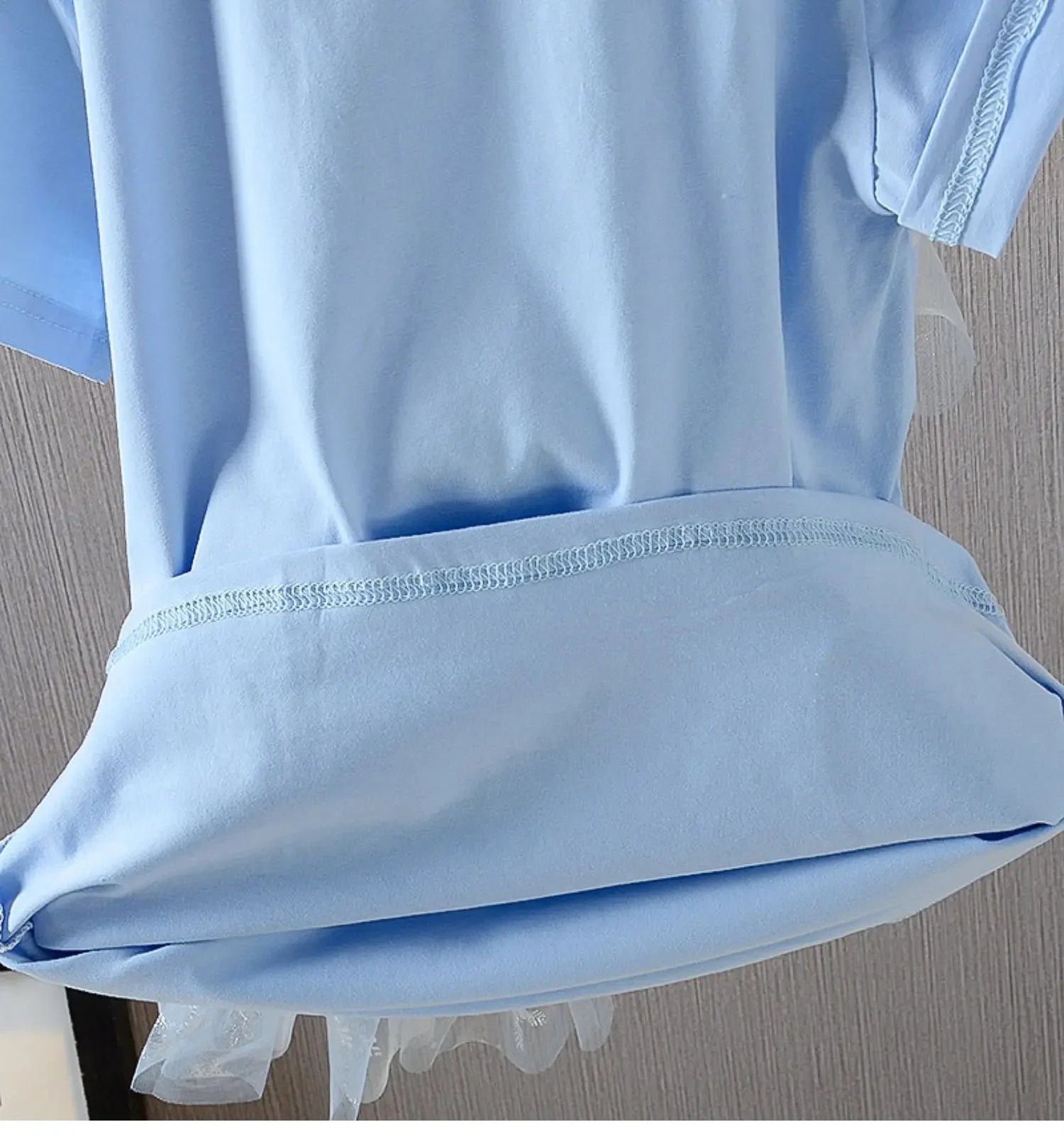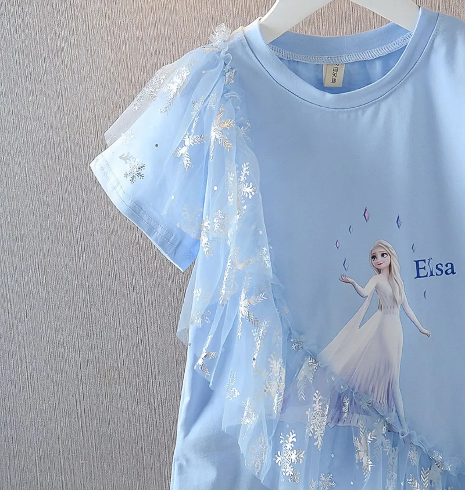 This beautiful girls’ dress blends comfort with a magical, fairytale-inspired design. Crafted from soft, breathable cotton, it features a light blue base enhanced with delicate layered tulle and subtle shimmer accents for an elegant, playful finish.